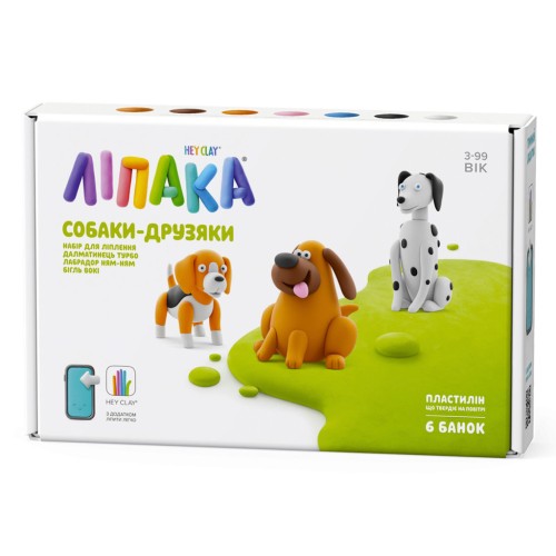 Набір пластиліну, що самостійно твердіє, ЛІПАКА – СОБАКИ-ДРУЗЯКИ: КОМОНДОР МУДІ, БУЛЬДОГ ГІПНО, ПУДЕЛЬ ПОППІ – розважить і малюків, і дорослих. За допомогою анімаційних інструкцій в додатку HEY CLAY, Ви зможете зліпити трьох кумедних героїв. Пластилін твердіє на повітрі протягом 24 годин, після чого можна гратися створеними фігурками.