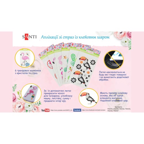 Аплікації із клейким шаром призначені для декорування сувенірів, фоторамок, шкатулок, блокнотів. Чудово підійдуть для прикраси предметів інтер'єру, використовуються в скрапбукінгу і кардмейкінгу. Мають прозору клейову основу, яка об'єднує елементи