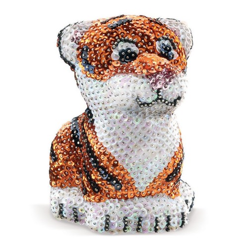 Яскравий тигр - вражаюча тривимірна фігурка, вкрита паєтками. Незвичний набір для творчості Sequin Art 3D зацікавить і дітей, і дорослих. Усі необхідні матеріали та інструменти є в комплекті, не потрібно нічого додаткового. Зокрема, в наборі знайдете: блискітки-паєтки різних кольорів, шпильки, форма-основа з пінопласту, інструкція. Процес виготовлення тривимірної фігурки нескладний і водночас дуже захопливий. Готовий виріб буде тішити око; яскравим блискучим котиком можна гратися, або ж подарувати рідним як сувенір. Набір рекомендований для дітей від 8 років.