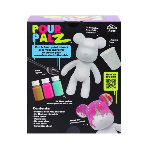В наборі: ведмедик Pour Palz (висота 22 см), 3*40 мл фарба (3-х кольорів), серветка, мірна ложка, чаша для змішування, рукавички, інструкція.