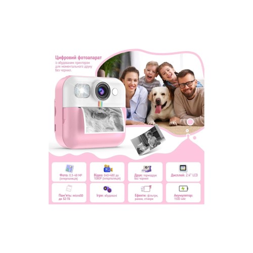 Дитячий фотоапарат ColorWay з функцією миттєвого друку (Pink) (CW-PHP01P)