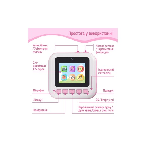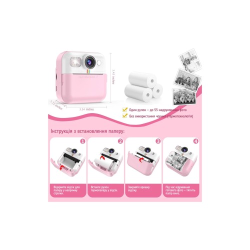 Фотоапарат виконаний у ніжному рожевому кольорі, що робить його привабливим для дітей. Його легка вага та компактні розміри дозволяють дітям легко брати його з собою куди завгодно. Завдяки простоті у використанні, навіть наймолодші фотографи зможуть швидко освоїти всі функції пристрою.