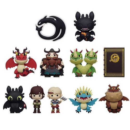 • В асортименті 11 головних героїв з яких 2 рідкісних: Беззубик, Гикавка, Астрід, Буревійка, Сарделька, Іклогак, Стоїк, Блювко та Відриг, Книга драконів, Логотип з драконом (рідкісний) і Милий Беззубик (рідкісна).