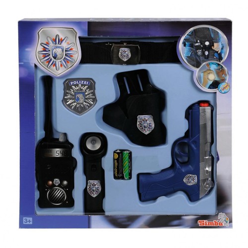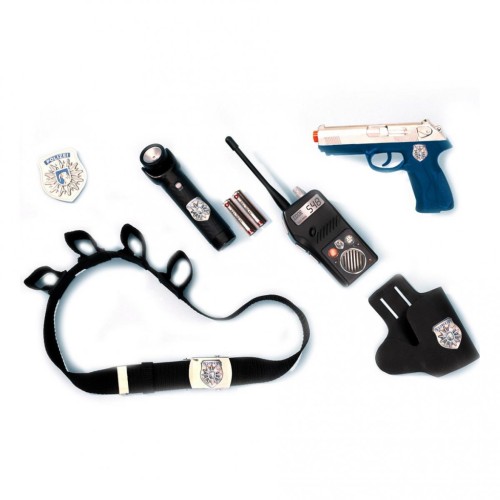 ремінь, пістолет з кобурою, рація, поліцейський значок, поліцейський ліхтарик (працює від 2 батарейок аа), 2 батарейки аа,