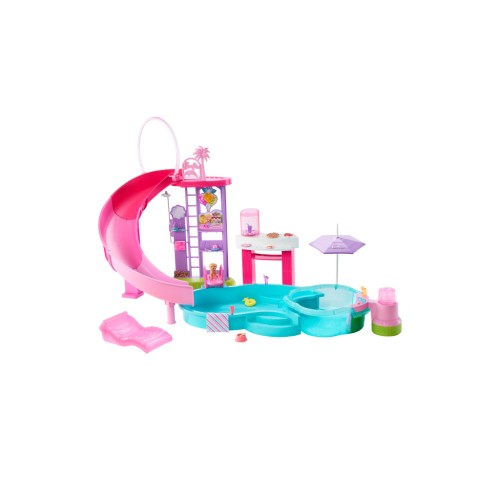 басейн із трампліном; джакузі з функцією бульбашок; рожева гірка; душова зона; зона снеків із барною стійкою; шезлонг; фіолетовий сонцезахисний навіс; цуценя, миска й кісточка для цуценя; щітка, гель, смугастий рушник і рушник із логотипом Barbie; матрац у формі ананаса; пара сонцезахисних окулярів; 3 стаканчика для напоїв; морозиво, 1 тарілка зі шматочками кавуна, 1 тарілка зі шматком піци, піца, виделка, ложка й порожня тарілка.
