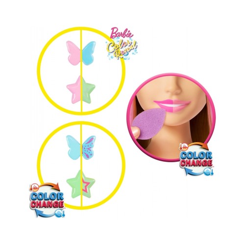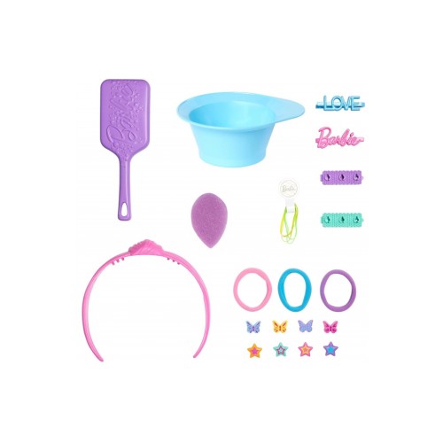 За допомогою аксесуарів та спеціальної мисочки з губкою можна проводити справжні перукарські експерименти: просто змочіть холодною водою ніжно-рожеві шпильки у вигляді метеликів та зірочок — і вони стануть різнокольоровими, гармонійно поєднуючись із волоссям Barbie.