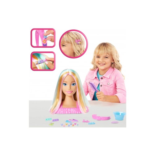 голова-манекен Barbie з кольоровим волоссям, спеціальна мисочка для води та губка для зміни кольору аксесуарів і губ, щітка для волосся, резинки, обруч, шпильки й заколки