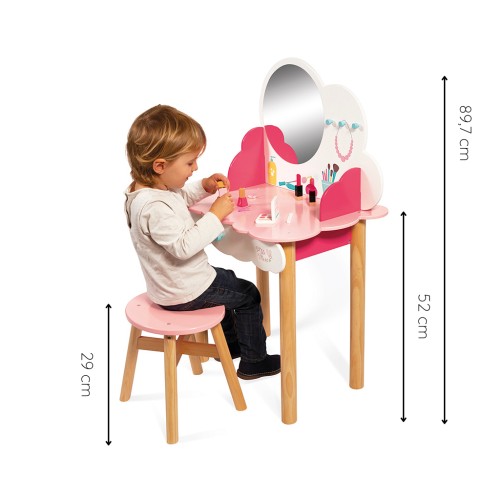 Дерев’яний туалетний столик від Janod створений спеціально для дітей і дозволяє їм відчути себе дорослими, збираючись разом із батьками. Столик оснащений великим дзеркалом та шухлядою, де можна зберігати важливі дрібнички або секрети. Він також має три гачки для підвішування намиста та браслетів, що додає практичності.