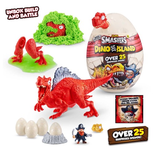 Фанату іграшкових динозаврів та піратської тематики точно сподобається іграшка у наборі SMASHERS Dino Island. Після розпакування потрібно розбити яйце, в якому знаходяться частини тіла хижака. Їх потрібно дістати з трьох субстанцій: слайма, пластиліну та кінетичного піску. У зібраному вигляді вийде червоний Спінозавр, один із найнебезпечніших хижаків Юрського Періоду. А ще ви знайдете маленькі фігурки піратів, з якими можна вигадати будь-який ігровий сюжет.