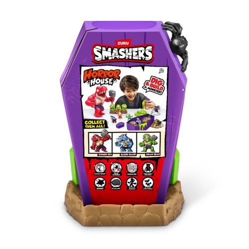 Будинок жахів Smashers Mega Horror House з 35+ сюрпризами Вирушай у захоплюючу пригоду разом з Smashers Mega Horror House! Розбий, викопай та збери монстра, щоб оживити його. Знайди більше ніж 35 сюрпризів всередині! Чи вистачить тобі сміливості відкрити труну та викопати свого монстра? Збирай усіх монстрів і готуй їх до битви! Особливості: 35+ сюрпризів: Відкрий понад 35 сюрпризів у Smashers Mega Horror House. Чи зможеш знайти їх усі? Світло та звуки: Помісти око в голову свого монстра для активації моторошних світлових та звукових ефектів. Копай та розбирай: Візьми лопатку та сміливість, щоб розкопати та оживити свого монстра. Пісок та слиз: Відкрий частини монстра, сховані у піску та слизі, для захоплюючої гри з тактильними ефектами. Попередження: Небезпека задухи — дрібні деталі. Не підходить для дітей віком до 3 років. Рекомендований вік: 3+ роки Потрібні батарейки LR44H: