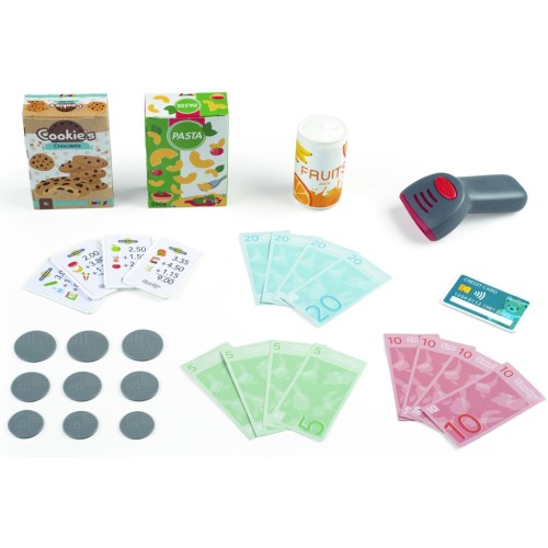 У набір входить 30 аксесуарів: сканер зі звуковим та світловим ефектом, вбудований калькулятор, механічні ваги, термінал із видачею чека, картка, продукти та іграшкові гроші з монетами. Діти граючи в продавця та покупця вчаться рахувати. Набір виготовлений із високоякісного пластику та має детальний дизайн. Відчуй себе дорослим та запроси друзів у свій власний магазин.