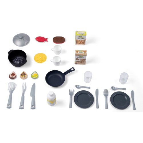 До набору входить 27 аксесуарів: м'ясо та риба мають два різні боки - сиру та смажену, чарівну пасту, капсули для кавоварки, столові прибори, сковорідку, та інше. Обід готовий, час до столу!