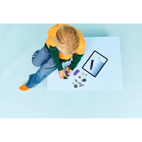 Особливістю моделі є її унікальний дизайн: автомобіль прикрашено стильним фіолетовим кольором з неоновим зеленим полум'ям. Наземний транспорт оснащено збільшеними задніми шинами та кабіною водія з дахом, який піднімається, що надає йому особливої естетики і динаміки. Серія LEGO City відмінно підходить для сюжетної гри, щоб діти могли створювати свої історії в місті, яке завжди рухається вперед.