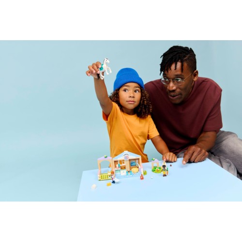 Заохочуйте дітей від 4 років створювати власні історії за допомогою ігрового набору LEGO Friends Ветеринарна клініка (42696) для дівчаток і хлопчиків. Детальний іграшковий набір ветеринарної клініки оснащений усім необхідним для дошкільнят, щоб грати в сюжетні ігри та доглядати за тваринами. Тут є конюшня, оглядовий кабінет, ліжка для тварин, корм, ветеринарне обладнання, ігровий майданчик для тварин та багато іншого. Іграшковий набір містить мініляльки Лео та Валерії, а також фігурки коня, собаки, кролика і 2 котів.