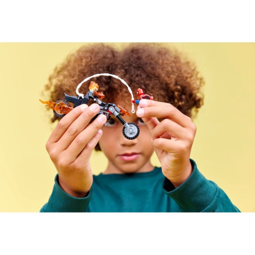 Почніть швидкісну гонитву супергероїв із конструктором «Людина-павук vs. Примарний вершник на мотоциклі» (76335) для хлопчиків і дівчаток віком від 6 років. Набір для конструювання LEGO Marvel із бойовим мотоциклом та 2 динамічними мініфігурками Людини-павука та Примарного вершника підживлює уяву дітей і спонукає до гри. Мініфігурка Примарного вершника зображена у вигляді скелета з полум'ям, що виривається з його рук і голови. Легендарний мотоцикл істоти має 2 полум'яні вихлопні труби та 2 вбудованих шипових шутери.