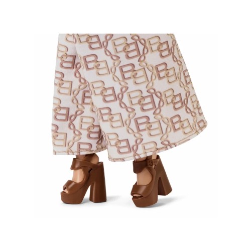 Образ доповнюють масивні босоніжки на підборах і об’ємне кучеряве волосся, яке підкреслює характер ляльки разом із акцентними сережками.