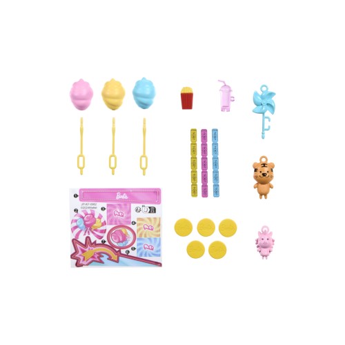 Опустіть жетон в автомат і дізнайтеся, чи виграли ви іграшку — миле поросятко, тигра чи вертушку! Потім вирушайте до апарата цукрової вати, щоб приготувати солодощі трьох кольорів. У наборі є також квитки за виграш в автоматі, смачні закуски для ляльки та наліпки, щоб прикрасити ігрову будку на свій смак.