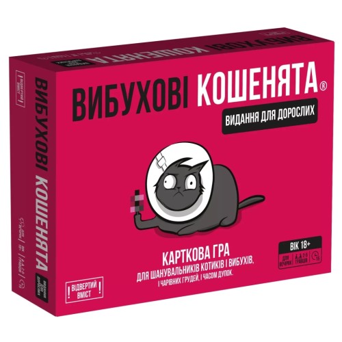 Вибухові кошенята: Видання для дорослих 18+ ідеально підходить для дорослих зі збоченим почуттям гумору й любов’ю до нешанобливих веселощів. Якщо ви влаштовуєте вечір ігор із друзями або шукаєте сміховинний криголам на вечірці, ця гра обов’язково стане хітом. Тільки будьте готові до того, що на вас чекає багато сміху, сюрпризів і, можливо, навіть кілька шокуючих моментів.