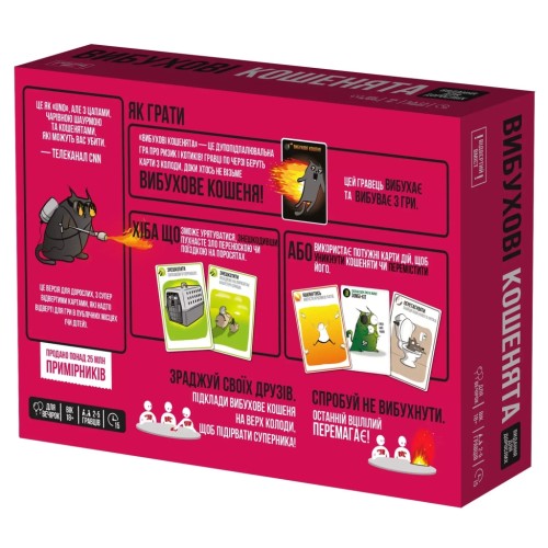Приготуйтеся до дикої і навіженої карткової гри, у якій поєднуються кошенята, вибухи і здорова доза абсурду. Ця версія хітової гри не для людей зі слабкими нервами, зі сміховинними, а іноді й зовсім недоречними ілюстраціями та гумором, який змусить вас сміятися вголос.