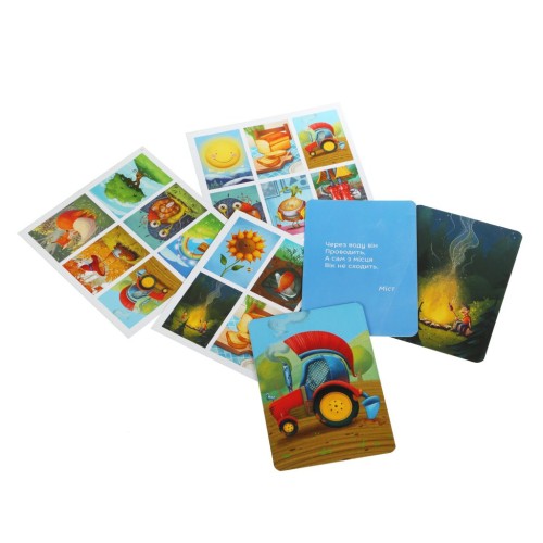 25 карток із загадками та малюнками-відповідями; 8 плашок із малюнками; комплект фішок; правила гри