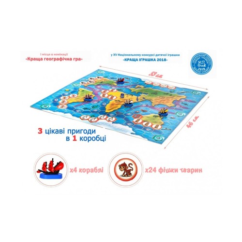 4 пластикові кораблі, ігрове поле, 4 планшети з жетонами тварин, кубик, правила