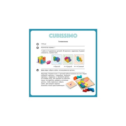 Cubissimo – це відмінна гра від французького бренду Djeco. Вона вже завоювала безліч шанувальників по всьому світу. Це розвага розвиває логічне мислення. Буде цікава не тільки дітям, а й дорослим.