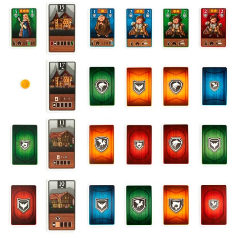 96 карт гостей, 8 плиток готелів, 20 жетонів монет, 1 жетон першого гравця, 4 карти очок за родини, 4 карти-підказки, 1 книжка правил