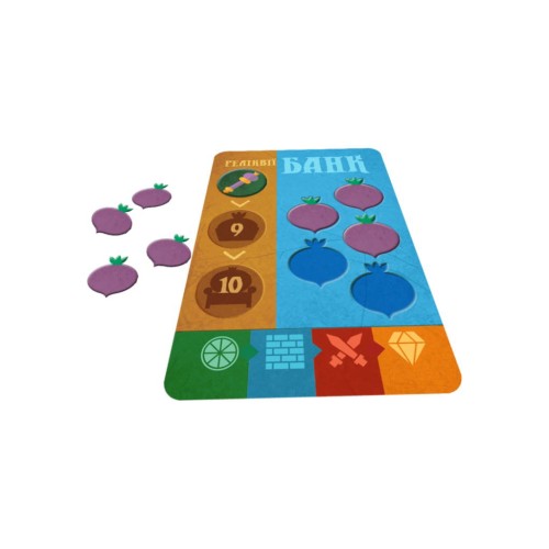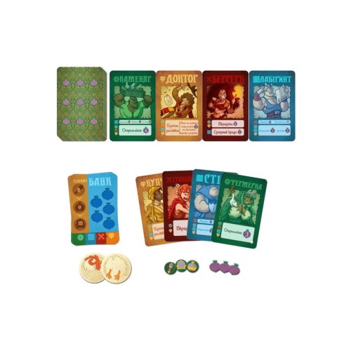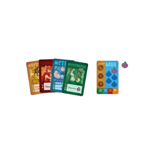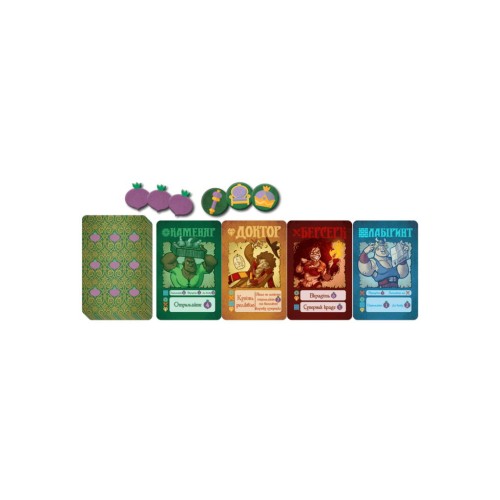 54 картки: 24 початкових, 24 ринку, 6 банку; 91 жетон: 72 ріпи, 18 реліквій, курка для жеребкування; правила гри