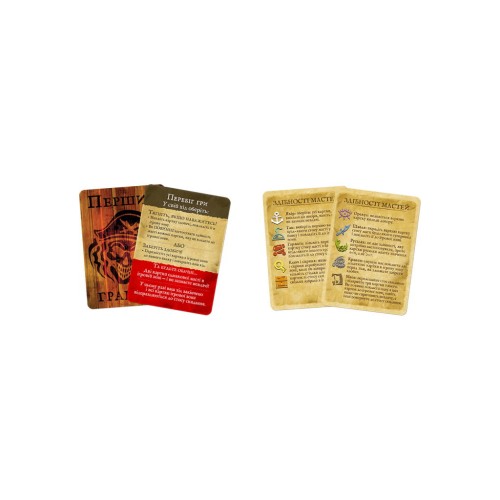 • Гармата відправляє верхню карту з будь-якої стопки суперника до скиду, а шабля – додає її в ігрову зону, але можна вибрати лише таку масть, якої немає серед вашої здобичі.