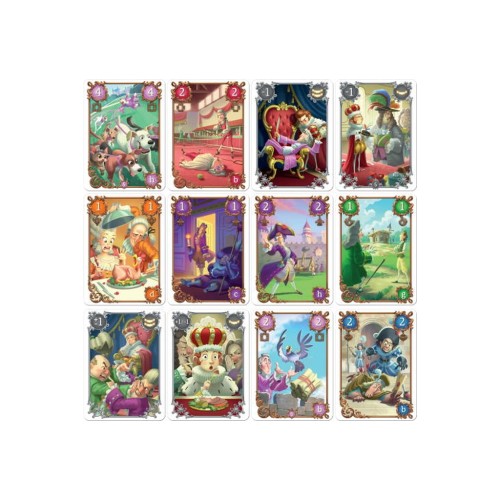 Всього у грі є три види карт: карти посад надають вам титул у вибраній царині після завершення гри, карти короля змінюють значення жетонів титулів і діють негайно без додання до колоди, а карти золота дозволяють придбати щось на аукціоні в другій фазі.