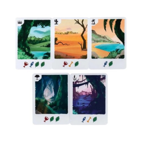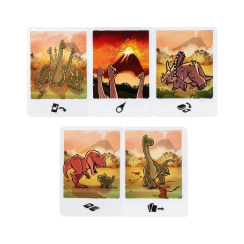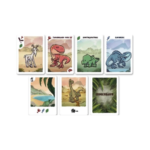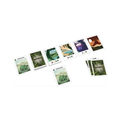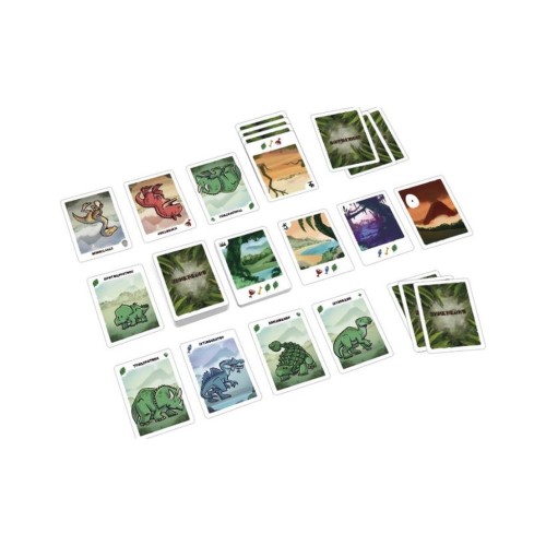 73 карти загубленого світу; 22 карти безпечних територій; 3 карти лічильника вимирань із цифрами від 0 до 5; 7 карт-пам'яток; 1 порожня картка для творчості; правила гри