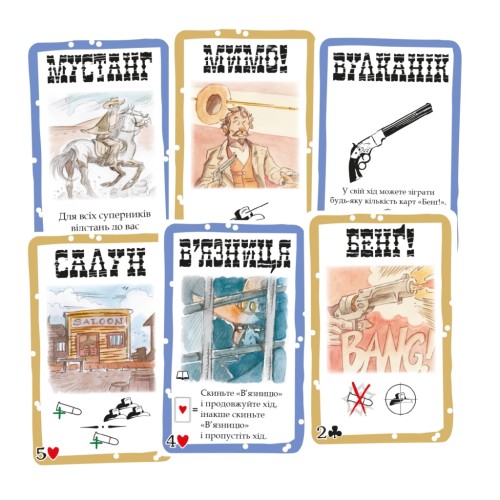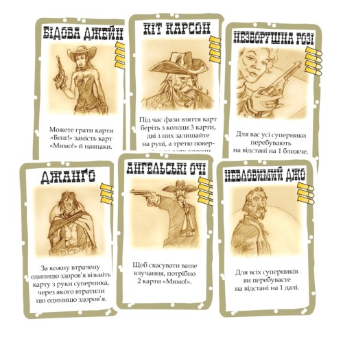 Усі учасники гри, крім ролей, також отримують персонажів з унікальними здібностями. Це відомі мешканці Дикого Заходу – Джанґо, Невловимий Джо, Малюк Біллі й інші літературні й кінематографічні герої. Перестрілка починається майже з перших ходів. Бандити вже можуть братися за шерифа, атакуючи його картами «Бенґ!», а той – вивертатися від пострілів за допомогою карт «Мимо!». Хтось буде обережно промацувати ґрунт, хтось кинеться оголошувати дуелі, розкривши свої наміри. Як і в «Манчкіні», у гравців є можливість підсилитися, вибравши кращу зброю, збільшивши або зменшивши відстань до суперника тощо. Щоб не померти від больового шоку, отримані рани можна вилікувати пивом. А ще у грі можна запустити по колу динаміт!