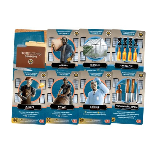 • Щоби побудувати, гравець витрачає свої жетони валюти на купівлю поліпшень для своєї винокурні, які дають такі переваги, як збільшення потужності або можливість витримувати спиртні напої.