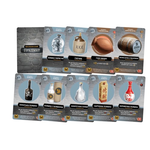 333 карти (56x87 мм), 187 картонних жетонів, 68 мінікарт (41x63 мм), 43 дерев’яні кубики й фішки, 20 великих карт переліків рецептів, 5 планшетів винокурень, 5 двошарових планшетів рецептів, 5 великих карт-пам’яток гравця, 3 ігрові планшети, 2 книжки правил