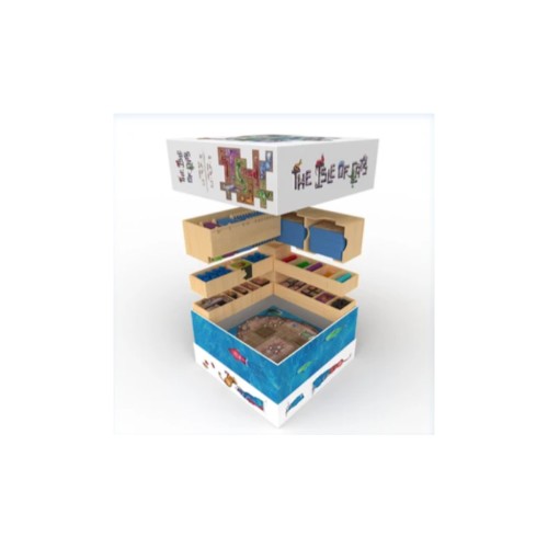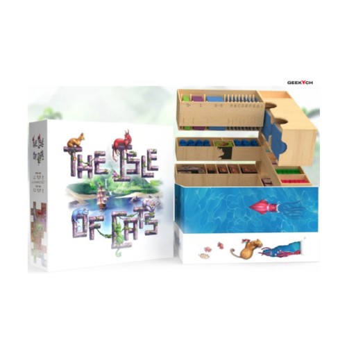 Це велика коробка (на 70% вища за звичайну коробку гри "Острів котів") з дерев’яним органайзером усередині. В органайзері помістяться компоненти базової гри "The Isle of Cats" і 5 доповнень, а також усі промки та аксесуари.