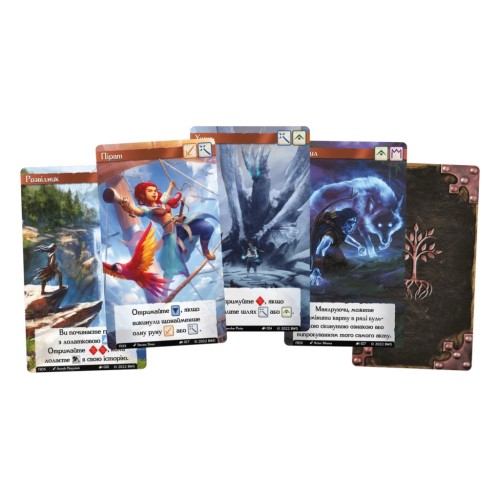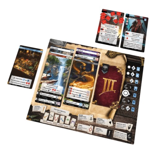 • Додавати карту в історію персонажа: Один раз за хід гравець може спробувати додати карту в історію персонажа. Для цього гравець кидає руни та порівнює символи на картах і символи на карті персонажа та історії. Якщо символи співпадають, гравець може додати карту до історії персонажа. Це дозволяє розвивати сюжет та додавати нові елементи до історії героя. Якщо гравець успішно пройшов випробування, він може отримати нову карту вміння, яку може використати під час майбутніх випробувань. Карти вміння надають додаткові переваги та можливості для гравця.