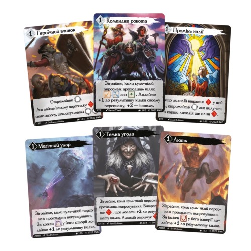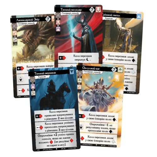 • Застосовувати ефекти карт персонажа: Карти спадку мають свої ефекти, які застосовуються, коли під час проходження випробування випадає руна "героя/антигероя". Карти походження дають жетони досвіду, а карти класу мають постійні ефекти, якщо на них викладено потрібну кількість жетонів досвіду.