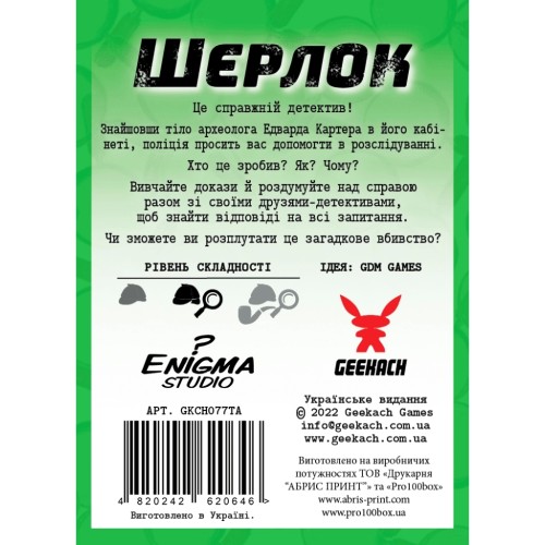 Якщо ви ніколи не пробували розгадувати таємничі справи у серії «Елементарно (Sherlock)», то саме час купити українську локалізацію цих ігор від Geekach Games. Випуск «Шерлок. Смерть Археолога» — одна з них, причому належить до середнього рівня складності, тож підійде й детективам-новачкам.
