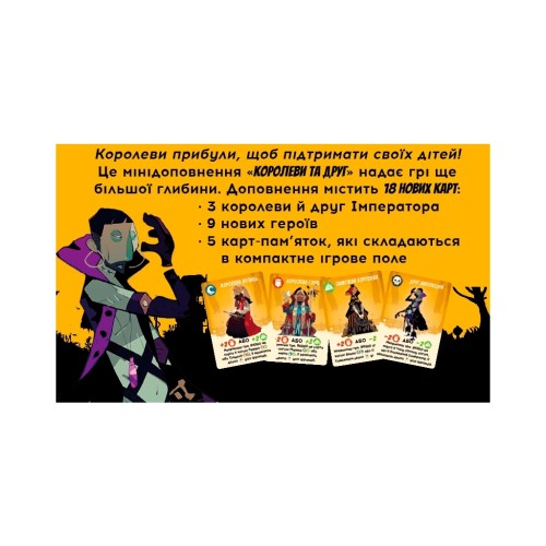 18 карт: 3 Королеви, Друг Імператор, 9 Нових героїв, 5 Карт-пам'яток
