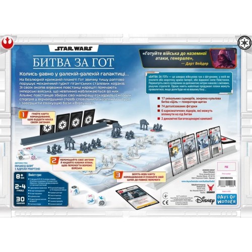 «Зоряні війни. Битва за Гот» - дуельна військова стратегія з деталізованими фігурками у світі культової космічної саги. Візьміть на себе командування силами Повстання, що відчайдушно борються за виживання, або очолте могутню армію Імперії, що невпинно наступає. Керуйте військами, використовуйте кубики для атаки та розігруйте карти командування, щоб перемогти ворожі війська. Відчуйте себе справжнім стратегом у битві на крижаній планеті!