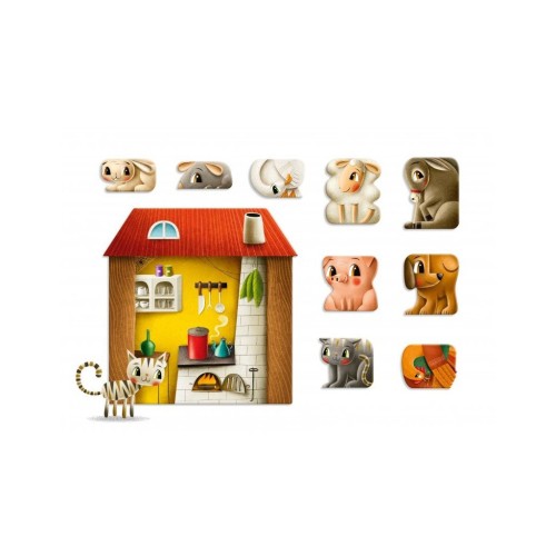 34 тваринки, 5 розбійників, дороговказ, двобічний планшет з будинком, правила гри