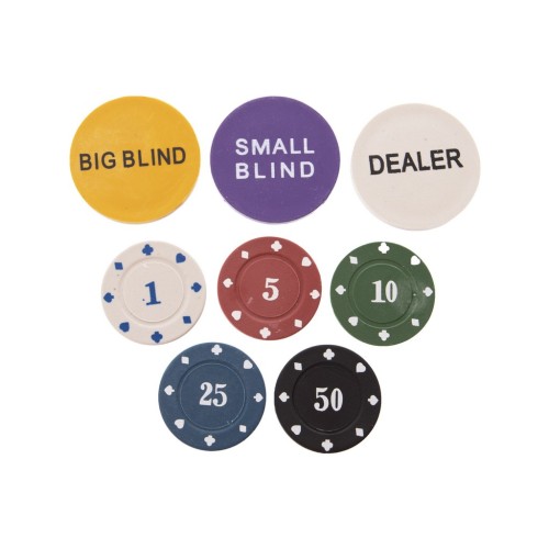 фішки з номіналом – 200, 300, 500 прим. фішки блайнд – 2 шт. фішка дилера – 1 шт. карти гральні (колода) – 2 шт. сукно – 1 шт. металева коробка – 1 шт
