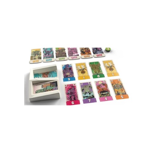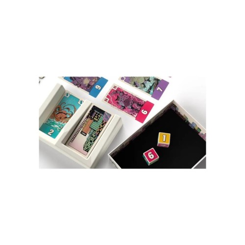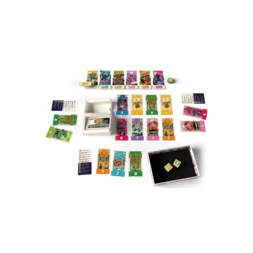 63 карти, 2 кубики, 12 жетонів, 1 підставка для карт, правила