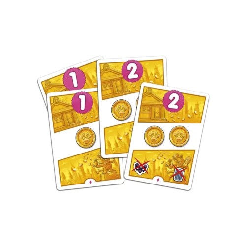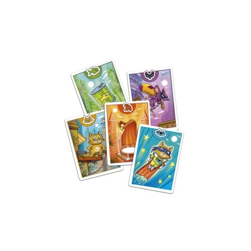20 карток з монетами, 4 карти мишей, 8 карт котячих смакот, 8 карт котів, 8 карт плащів, 1 карта Супермяу, правила
