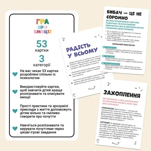 У кожній карті є сценарій із життя, який допоможе вашій дитині зрозуміти, як реагувати на труднощі та виклики. Ви, як батьки, зможете легко пояснити дитині, що таке радість, гнів, туга чи страх і як із цим працювати, просто прочитавши текст на картках.