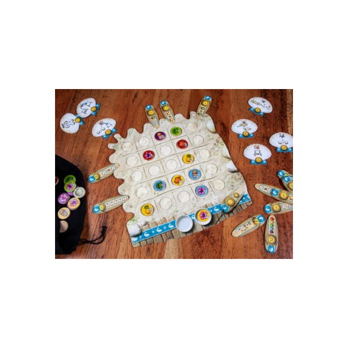 • Але це ще не все — жетони удачі додають у гру додатковий рівень стратегії. Якщо на початку раунду хтось витягнув талісман, витягніть жетон на заміну, а потім використовуйте та викидайте одну зі своїх власних плиток талісмана, щоб обмінятися жетонами, покласти жетон як джокера або поміняти вже заповнене табло на інше.