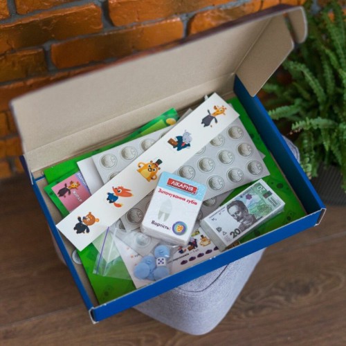 гральне поле, кубик, фішки-персонажі, документ банкіра, картки "Школа", картки "Інвестиції", картки "Лікарня", картки "Біржа праці", картки "Розваги", купюри та монети, підставки для фішок-персонажів, правила гри