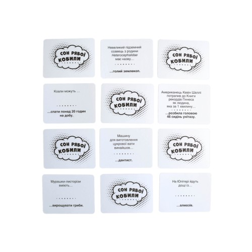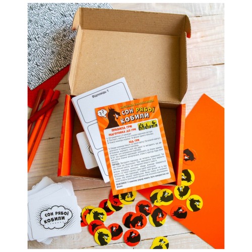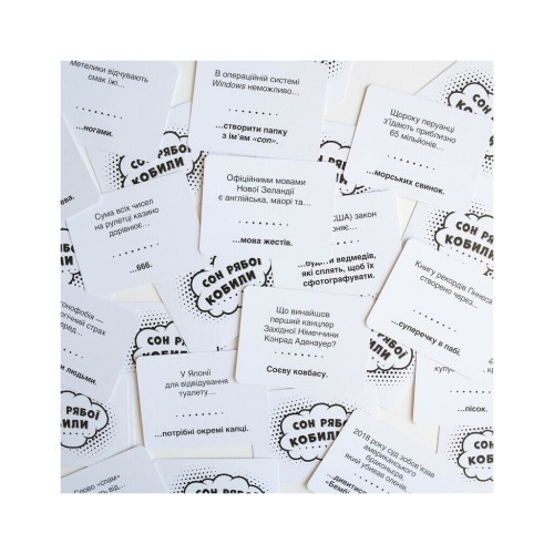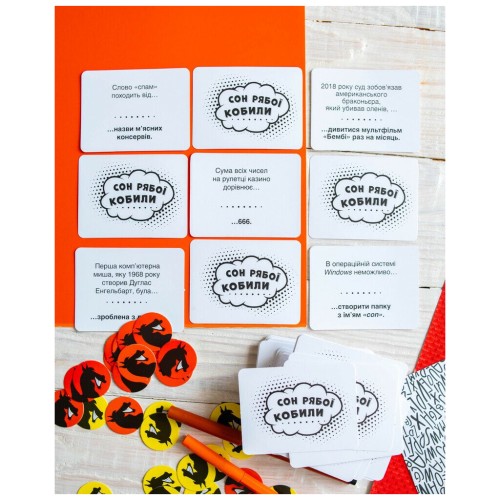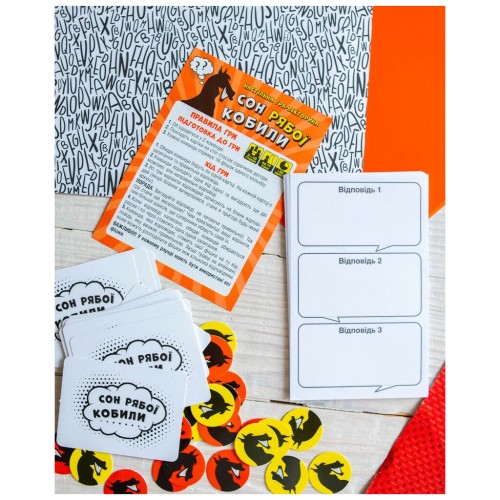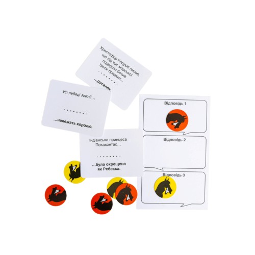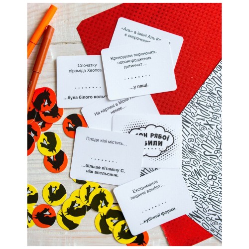 У комплекті ви знайдете 224 картки, фішки, бланки та детальні правила, написані українською мовою. Гра пропонує учасникам створювати креативні, часом абсурдні варіанти відповідей на питання, вводячи суперників в оману. Перемагає той, хто не лише ерудований, а й здатен створити атмосферу живого спілкування і веселого хаосу.