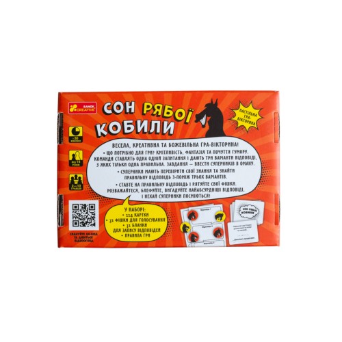 Настільна гра "Сон рябої кобили" від Ранок – це унікальна карткова гра, яка перетворить вашу вечірку або дружню зустріч на справжнє свято фантазії та кмітливості. Цей розважальний жанр призначений для підлітків від 14 років, охоплюючи велику кількість гравців – від 2 до 7+, що робить гру ідеальною для будь-якої компанії.