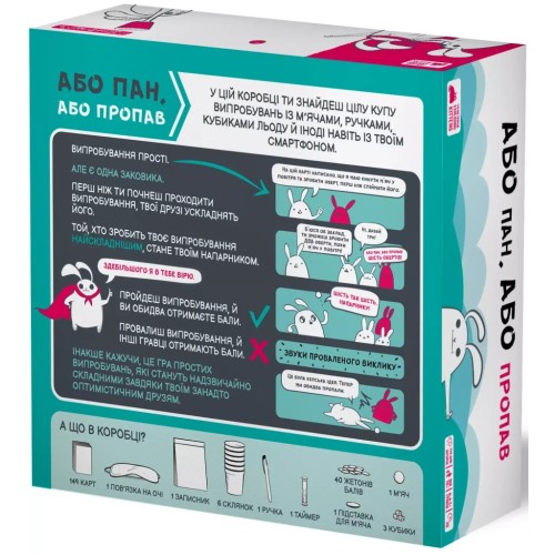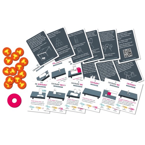 У грі є 150 завдань, для яких використовуються реквізити, наприклад пов'язка на очі, чашки та м'ячики, кубики, ручки та інше – все це входить до комплекту.